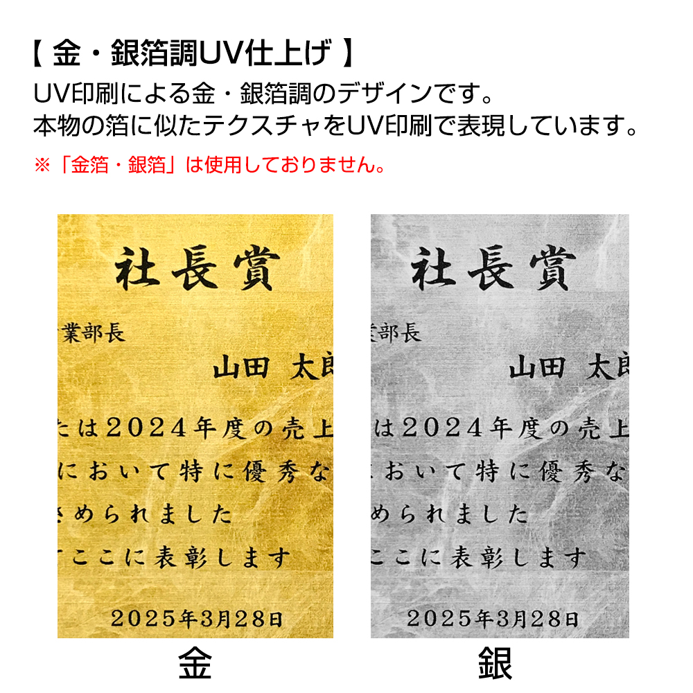 1. まるで金箔のようなテクスチャの金箔調UV仕上げ表彰楯