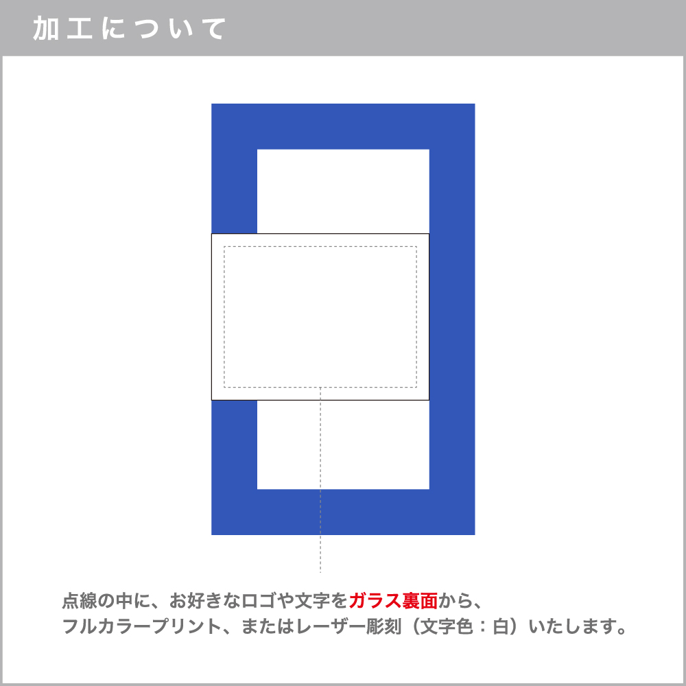 | 加工方法 | 【最先端のレーザー彫刻】 業界最速!ガラス表面に細かく彫刻を行います。 ※レーザー彫刻はウラ面に彫刻します。 【最先端フルカラーUVプリント】 再現色20万色グラデーションも美しく発色します。 |