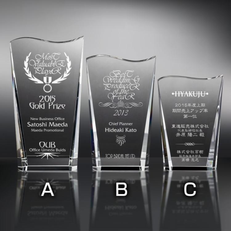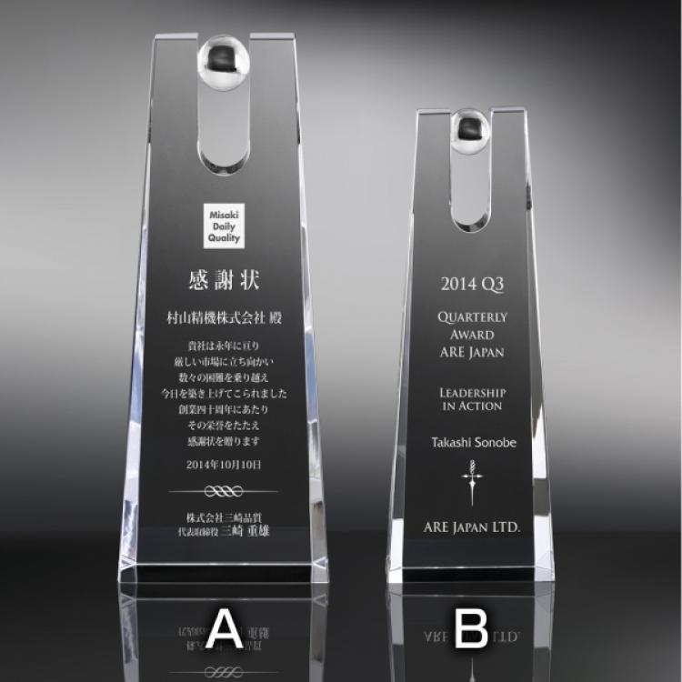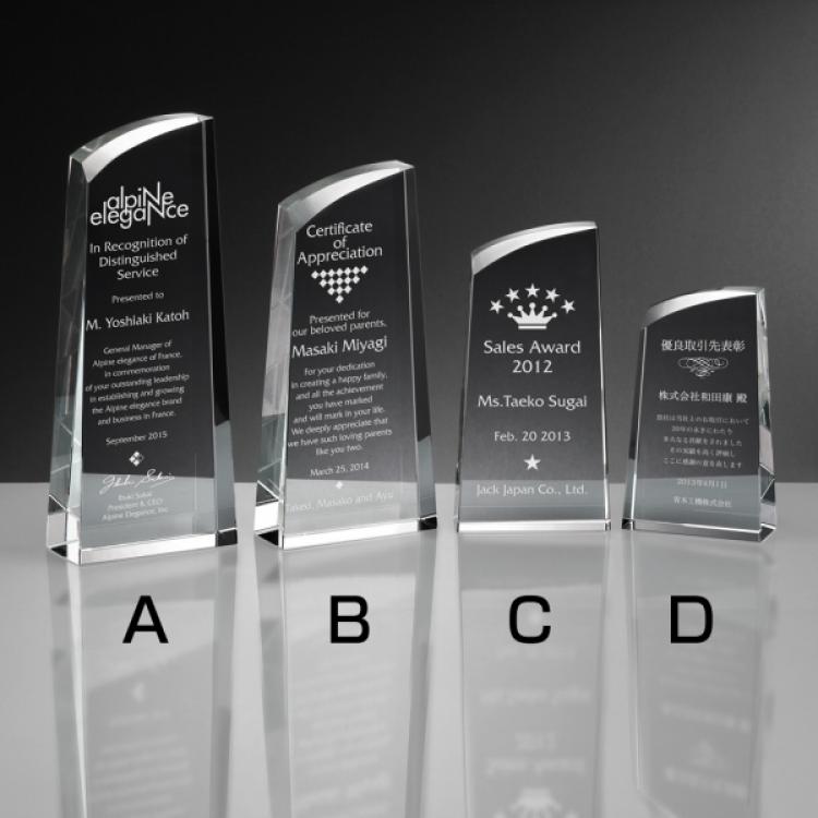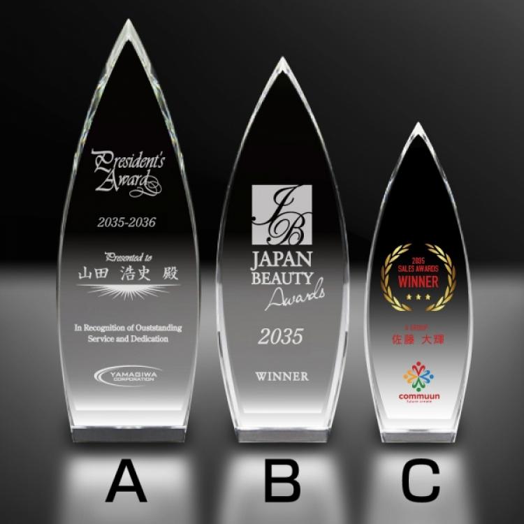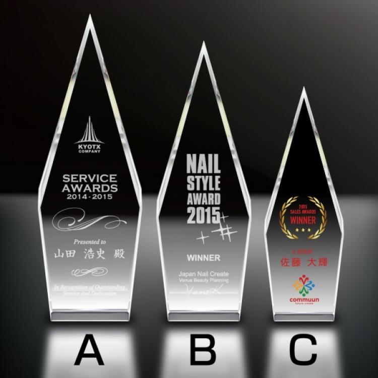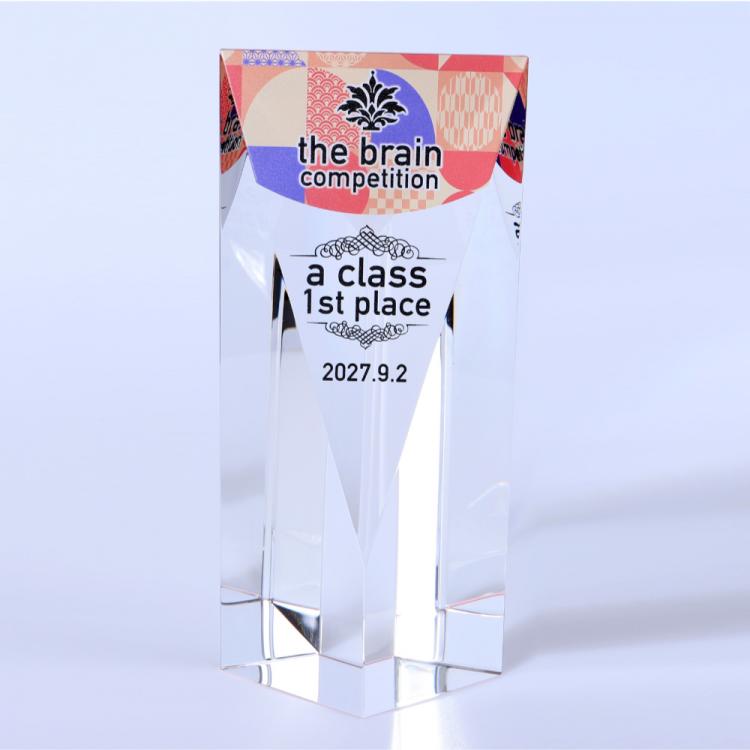 格式の高い表彰シーンに映えるデザイン、実際に手に取って納得の品質を備えたクリスタルトロフィーになります。