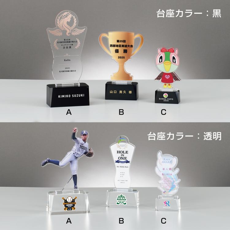 複雑な造形はアクリル製ならではです。ガラス製では難しいデザインを選ぶのもいいでしょう。また、大規模なイベントや、飾る場所、使用頻度などによっては、破損しづらいトロフィーが求められます。手を滑らせてトロフィーを落としてしまうハプニングもあるので、シチュエーションよってはアクリル製がお勧めです。・売れ筋デザイン