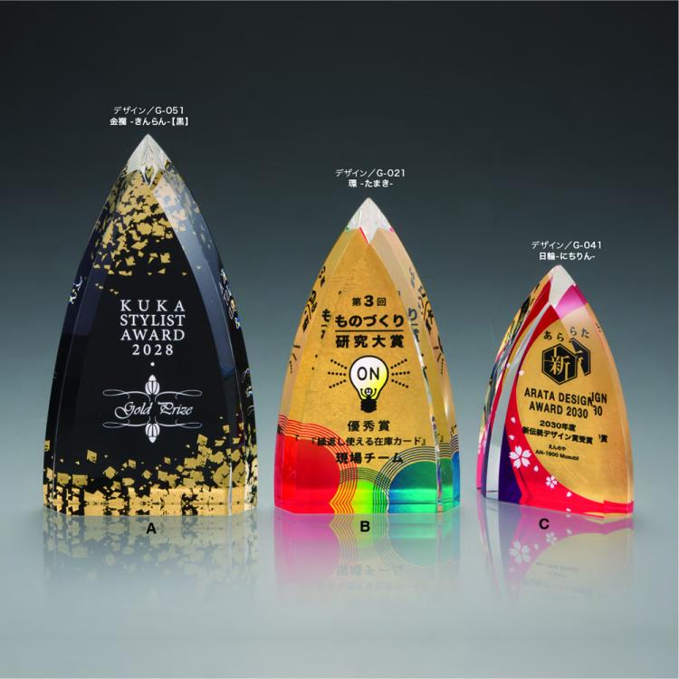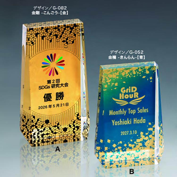 1.クリスタルトロフィーは「高級感と見栄えします」2.近年売れ筋の「競技表彰向けのクリスタルトロフィー」